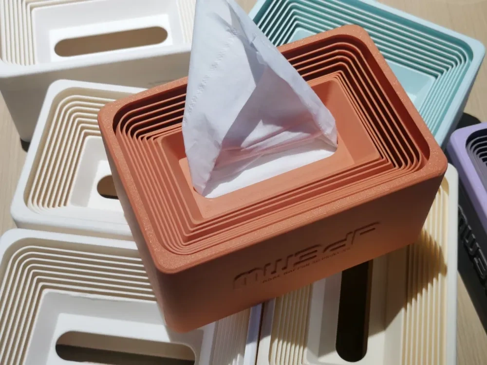 这款自然沉降抽纸盒最初的灵感是来源于一个的实际简单需求,同时也触发了对日常小烦恼的思考—大家是不是都有过抽纸快用完时,底下几张难够着的经历?3D打印在制作复杂机械结构上的独特优势,或许能完美解决这个痛点。随着纸巾不断被抽出,里面的层叠结构会像楼梯一样缓缓下降,始终把剩余的纸巾保持在最方便拿取的位置。这样,直到最后一张,取用都非常轻松。